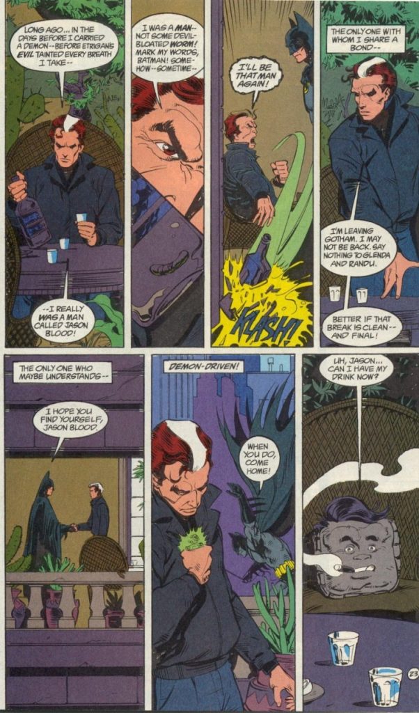 Como nunca cae mal un poco de ayuda, y como Grant era escritor de Batman en ese tiempo, el detective de Gotham hizo algunas apariciones en el comic de The Demon, comenzado con el número 3, del 24 de julio de 1990.