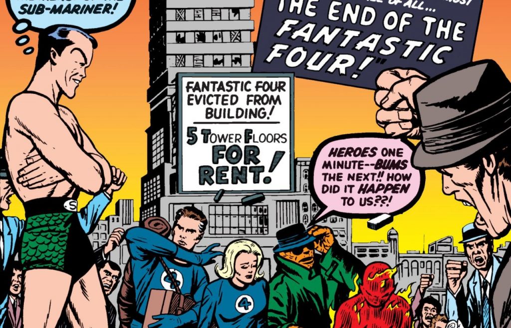 En la novena edición de Fantastic Four, vemos cómo el cuarteto va a la quiebra y pierde todas sus posesiones. El planteamiento es un poco inverosímil y señal de que Lee y Kirby aún concretaban el concepto moderno del superhéroe, por lo que no era extraño ver ciertas incongruencias.