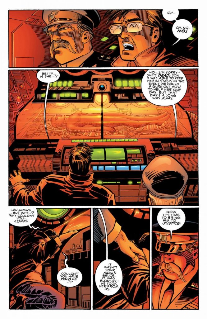 Para persuadirlo (manipularlo) Ross lleva a Banner a una base secreta donde le muestra el cuerpo de Betty, que es mantenido en animación suspendida, por lo que existe una pequeña esperanza de que resucitarla, si bien no hay manera de hacerlo por el momento.