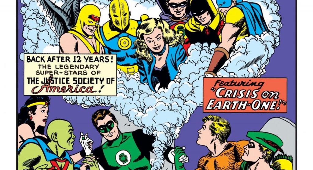 En el comic de The Flash, se había establecido que el primer colectivo de héroes de la industria del comic norteamericano, The Justice Society of America (La Sociedad de la Justicia de América), había salido del retiro para retomar su actividad en su mundo, denominado Tierra 2, al que pertenece el primer Flash, Jay Garrick y los héroes de la Era de Oro de DC. Los eventos ocurrieron en The Flash #137.