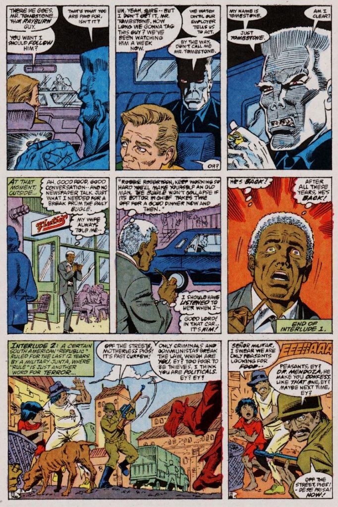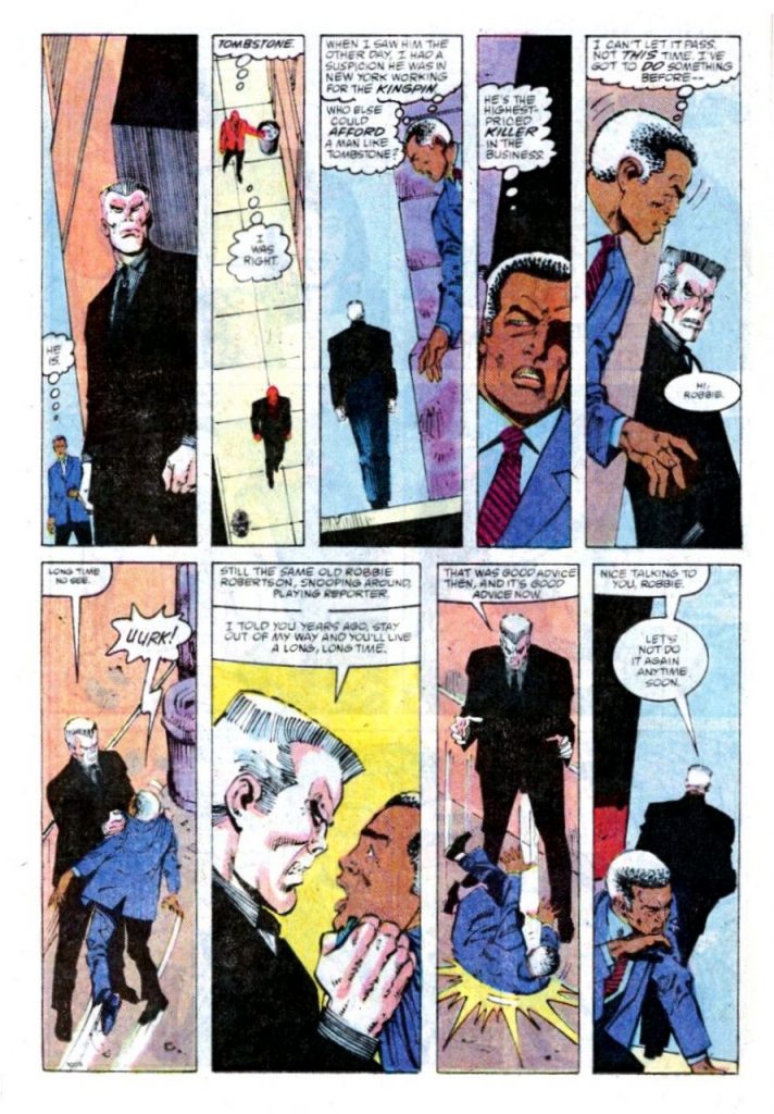 Web of Spider-Man #36, tiene otra historia principal, realizado por el equipo creativo de Conway y Saviuk, además de un gran trabajo de tintas por parte de Keith Williams. La presentación de Tombstone se lleva solamente 6 paneles. El villano se encuentra a bordo de una limosina y lo conocemos en tres de esas viñetas. Mas eso resulta no ser tan relevante como el hecho de que es reconocido por el editor del Daily Bugle y amigo de Peter Parker, Robbie Robertson, quien queda sorprendido.
