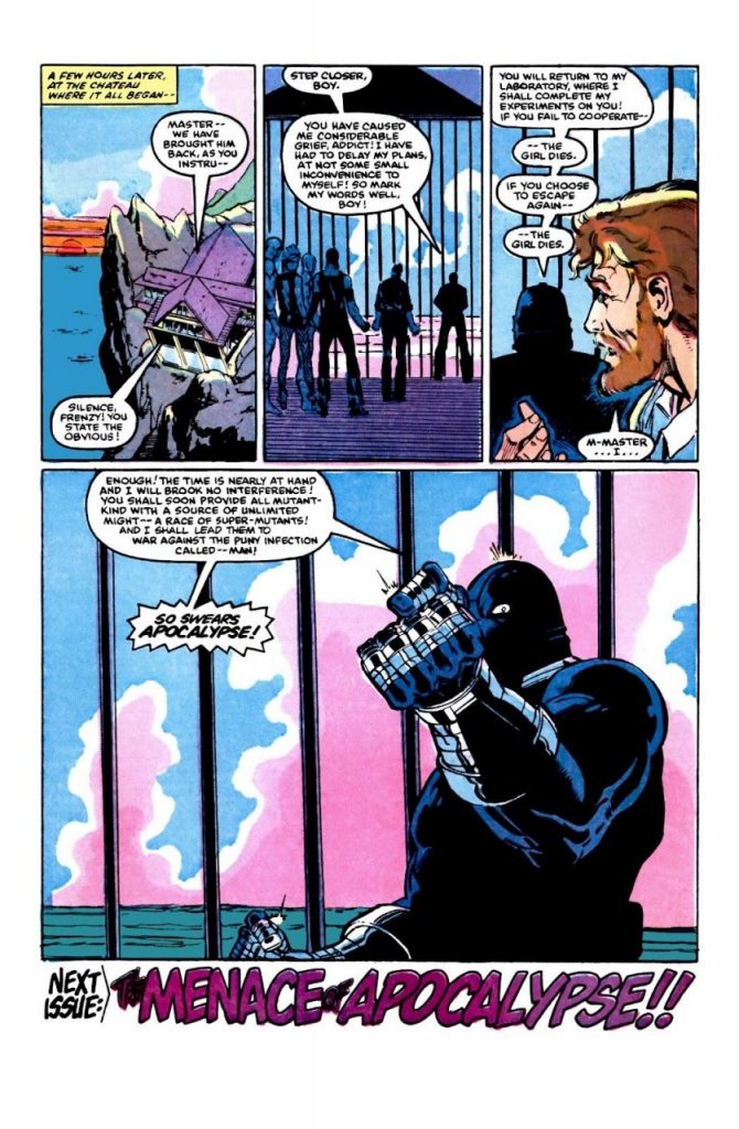 Una vez presentado, el mito de Apocalypse fue creciendo con el tiempo, así como su peligrosidad y motivaciones. Si bien en ese primer número se le ve como el líder de una banda de mutantes, e incluso describe su poder de mutación como la habilidad para controlar sus moléculas, no era el ser casi inmortal que conocemos hoy en día.