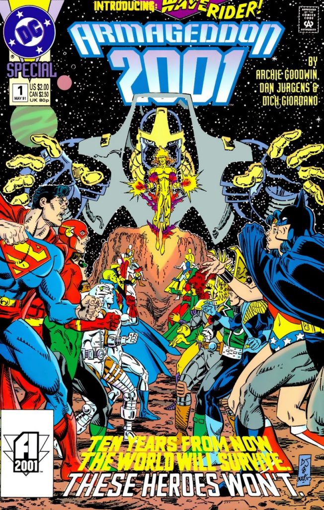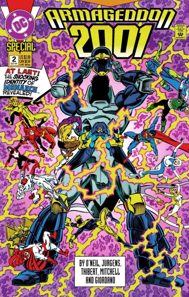 DC Comics realizó un evento magno en sus comics de 1991, con la publicación de Armaggedon 2001, una historia que transcurre en el mismo año dentro de la continuidad de DC, y en la que se presagia una catástrofe cuando un poderoso ser, llamado Monarch, destruye a todos los héroes de ese universo y se corona como… bueno… monarca indiscutible.