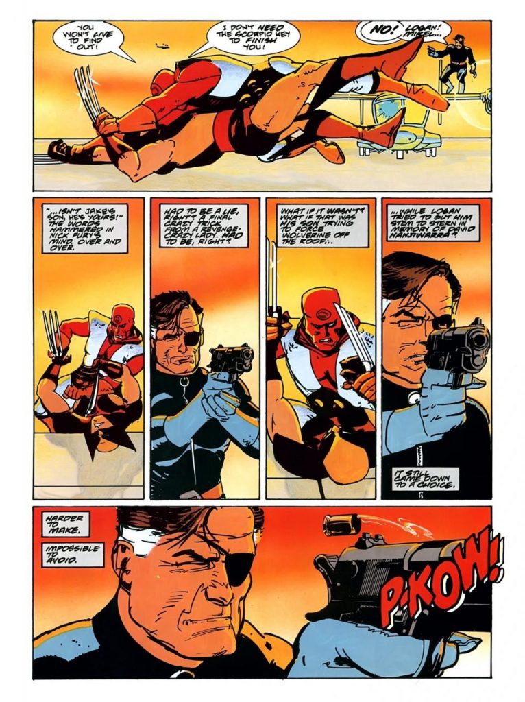Los últimos dos últimos nombres corresponden a los creativos responsables de haber realizado la novela gráfica titulada Wolverine, Nick Fury: The Scorpio Connection, y que fue publicada el 11 de julio de 1989.