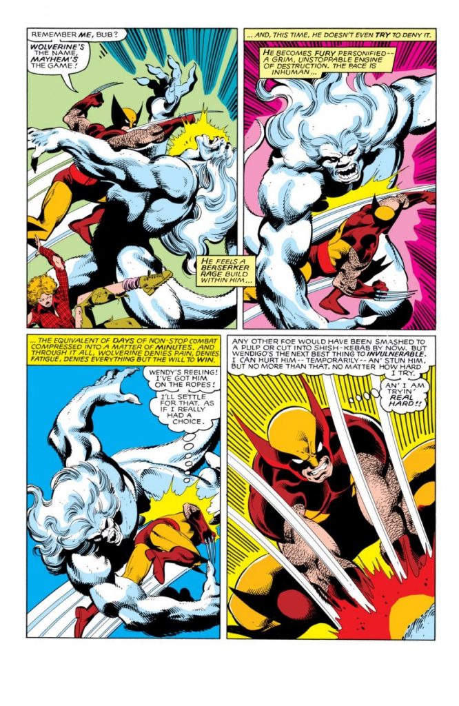 En una secuencia, Logan y Kurt dialogan. Claremont aclara la forma de actuar de Wolverine, que podría considerarse demasiado agresivo por sus garras de metal. Logan asegura que nunca ataca sin provocación y que solo responde en la proporción con que es atacado, ayudando a cimentar al mutante como una persona con alto sentido del honor.