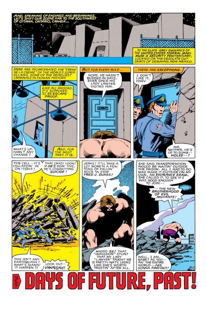 En el epílogo de X-Men #140, The Blob escapa de prisión y se anuncia la aparición de The NEW Brotherhood of Evil Mutants. Al número siguiente, debuta dicho equipo como parte de la historia, “Días del futuro pasado”.