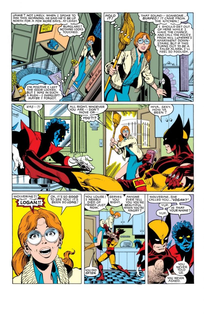 Nightcrawler dice, “Wolverine, ella (Heather), te llamó Logan”.