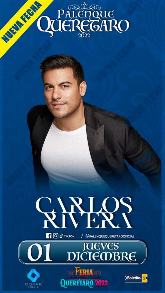 Ante las peticiones del público de Querétaro, el cantante Carlos Rivera anuncia una fecha más en el Palenque de la Feria Internacional Ganadera de Querétaro. El cantante estará también el 1 de diciembre en el Eco Centro Expositor.