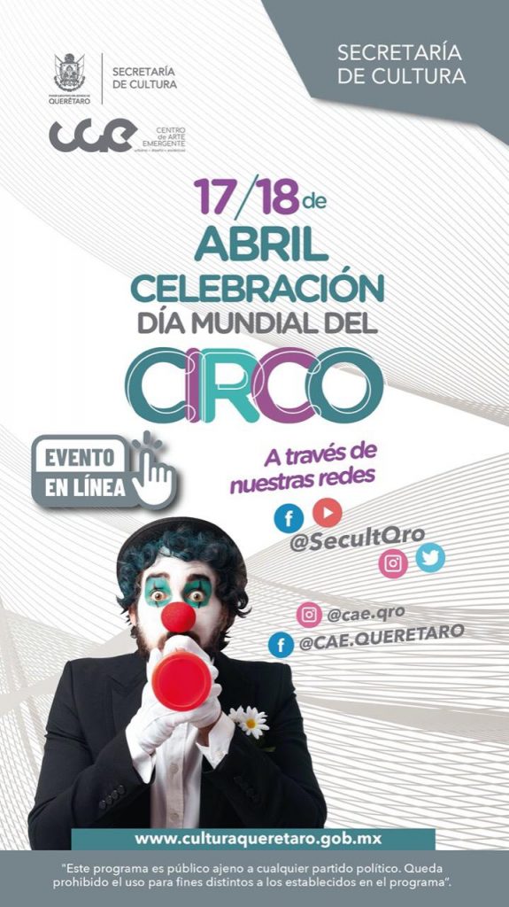 Con la finalidad de brindar opciones que ayuden a generar salud mental y actividades que puedan compartir desde casa con la familia, la Secretaría de Cultura del Estado de Querétaro invita a disfrutar la cartelera especial virtual con motivo del Día Mundial del Circo.