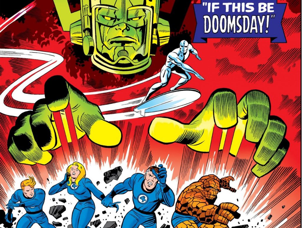 En el caso de Kirby, uno de sus picos creativos dentro de Fantastic Four fue con la saga de tres partes que hoy recordamos: las primeras apariciones de Galactus, Silver Surffer y The Watcher. Stan Lee deseaba enfrentar al cuarteto de aventureros contra un villano que fuera más que terrenal, una amenaza cósmica de proporciones apocalípticas. Kirby diseñó a Galactus, un gigante con vestiduras semejantes a las de los guerreros romanos. También creó a su contraparte griega, más filosófica y racional: The Watcher (que fue presentado meses antes, en Fantastic Four #29).