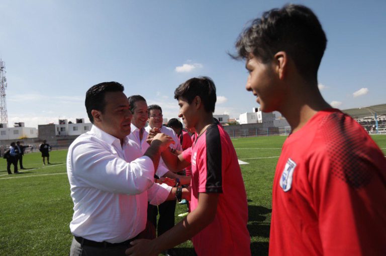 Entrega Nava cancha de futbol en el COBAQ 17.