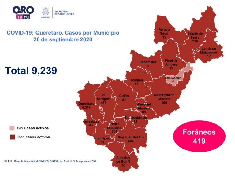 Querétaro con un registro acumulado de 8,826 de Covid-19