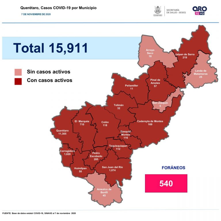 Querétaro registra un acumulado de 15,911 casos de Covid-19