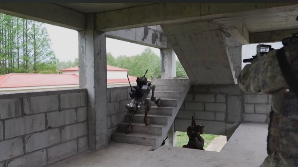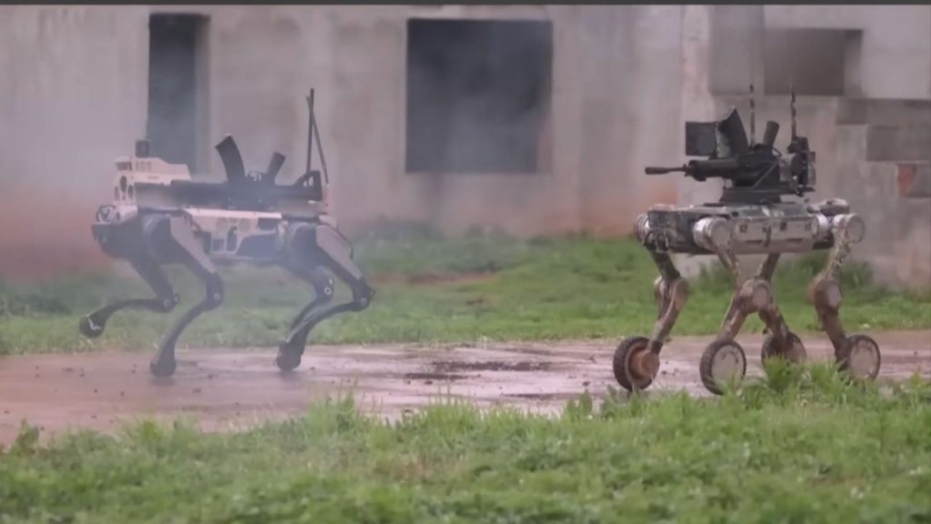 Por otro lado, China expone demostraciones prácticas de su poderío tecnológico bajo una narrativa bélica de defensa consistente. Los medios estatales han transmitido maniobras simuladas con perros robot armados operando en contingentes sincronizados con drones y naves nodrizas, especialmente para casos de combate urbano entre calles, edificios, azoteas y callejones.